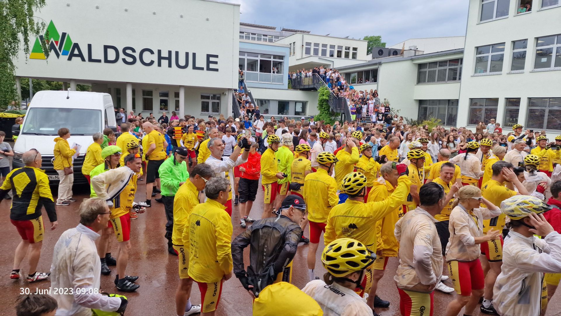 Das war wirklich ein ganz besonderer Moment, als 120 Radler und Radlerinnen der Tour Ginkgo begleitet von epischen Keyboardsounds unserer Musiklehrer (unter der Leitung von Simon Brommer) auf den Schulhof der Waldschule Degerloch abbogen! Nach ersten Grußworten durch den Moderator der Tour Ginkgo und einer sehr herzlichen Begrüßung durch unsere Geschäftsführerin Frau Peter, zeigten die zahlreichen Schülerinnen und Schüler der Waldschule Degerloch mit La-Ola-Wellen, dass das nicht so gute Wetter keinen Einfluss auf die Stimmung bei der Begrüßung hatte! Tatsächlich hörte es genau mit dem Eintreffen der Tour Ginkgo auf zu regnen und der Aufbau durch die Technik-AG, die bereits eine Stunde vorher emsig beschäftigt war, konnte perfekt zum Einsatz kommen. Was dann folgte, war Waldschulatmosphäre pur: Zunächst konnte die Zirkus-AG unter der Leitung von Jaco Bosch mit einem sehr lustigen, sportlichen Sketch und einer extra für die Tour Ginkgo einstudierten Bicycle-Tanzakrobatik-Aufführung zeigen, was sie draufhatte. Das von zwei Schülerinnen im Anschluss vorgetragene Lied „Cover me in Sunshine“ rührte dann so manchen im Publikum zu Tränen. Im Anschluss wurden mehrere Spenden auf der Bühne unter dem Dach unserer Grundschule überreicht, unter anderem von dem Montessori-Kindergarten Degerloch, mit dem Iris Kurz (mehrfache Weltmeisterin im Kunstradfahren) als Erzieherin unserer Nachbareinrichtung mit „ihren“ Kindern auf die Bühne kam.