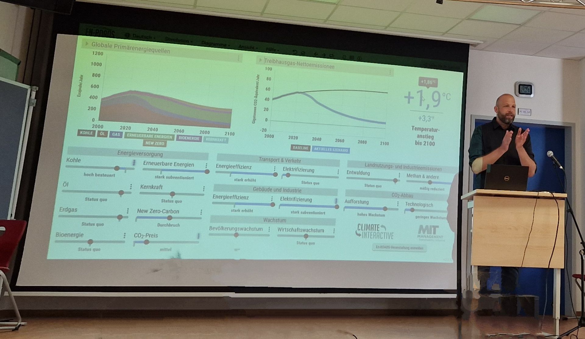 Die Software errechnet aus den Eingaben durch einen Datenabgleich verschiedene Auswirkungen und stellt dies in verschiedenen auswählbaren Graphen dar. Darunter befinden sich zum Bespiel die Quellen der weltweiten Energiegewinnung oder die prognostizierte Erderwärmung zum Jahr 2100. Am Ende des Workshops erreichten wir mit unseren beschlossenen Maßnahmen eine Erderwärmung von 1,9 Grad Celsius zum Jahr 2100 und erreichten somit das Ziel der Veranstaltung. Natürlich blieben auch nach der Veranstaltung noch Fragen bezüglich der Umsetzbar- und Finanzierbarkeit offen.